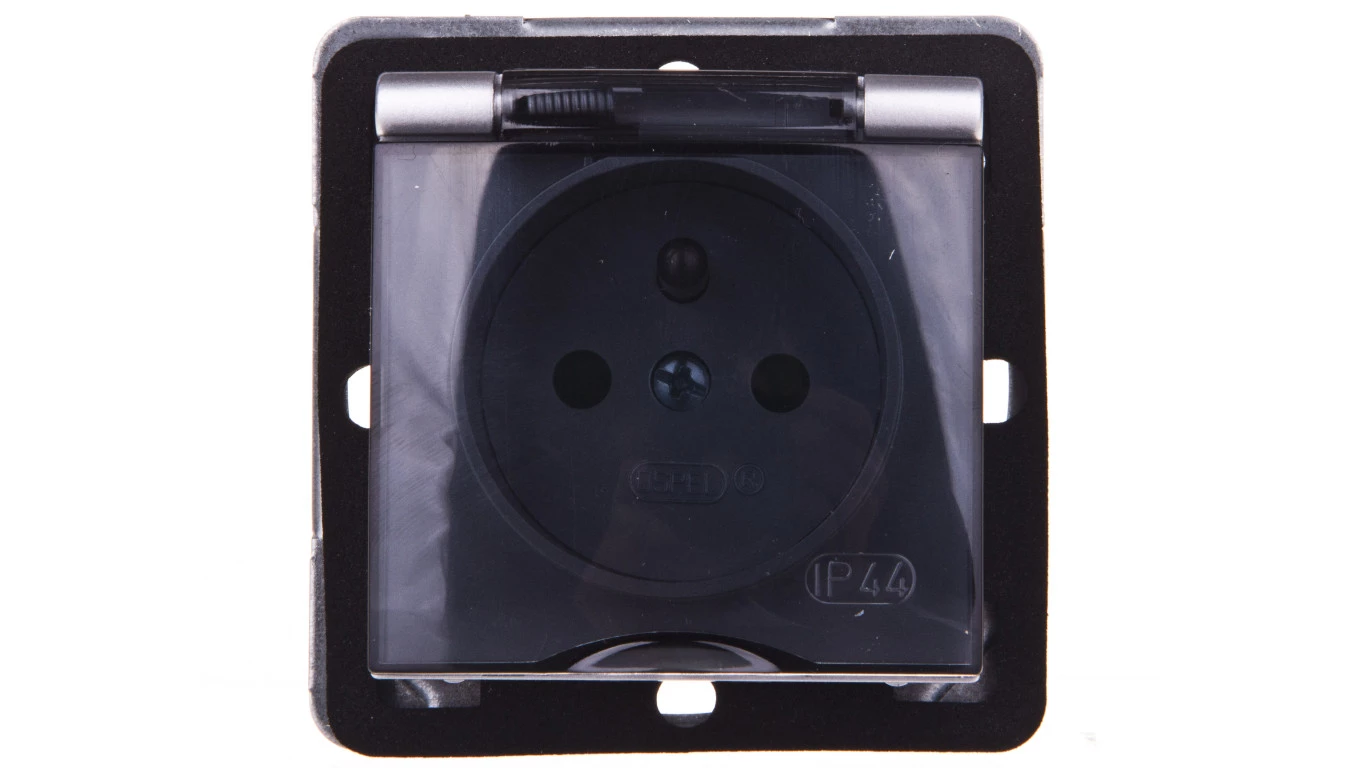 IMPRESJA Gniazdo bryzgoszczelne z/u IP44 z przesłonami klapka przezroczysta srebrne GPH-1YZP/m/18/d