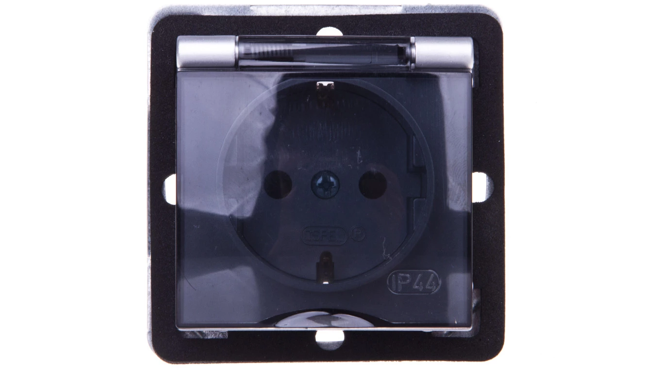 IMPRESJA Gniazdo bryzgoszczelne z/u Schuko IP44 klapka przezroczysta srebrne GPH-1YS/m/18/d