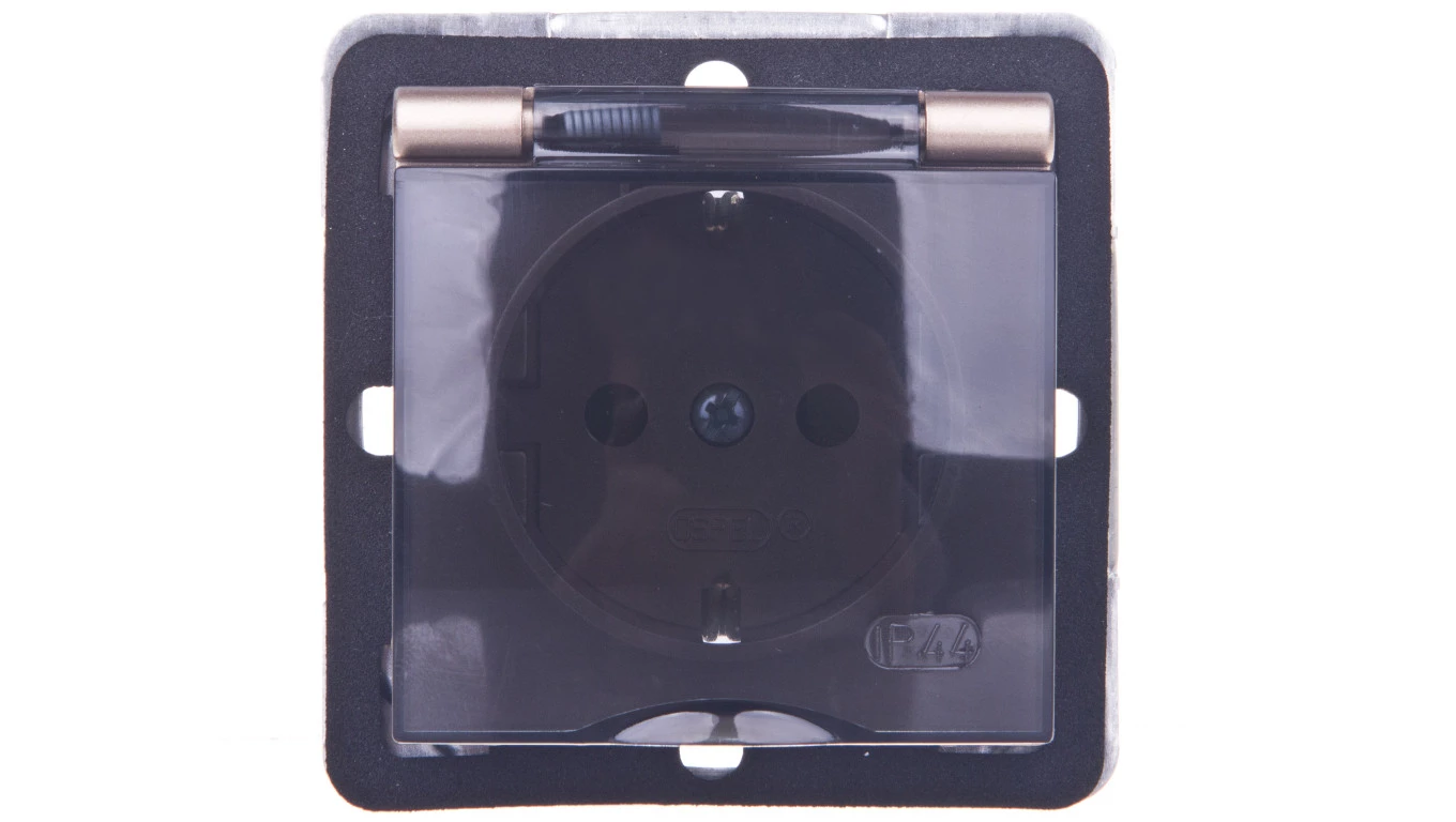 IMPRESJA Gniazdo bryzgoszczelne z/u Schuko IP44 z przesłonami klapka przezroczysta złoty metalik GPH-1YSP/m/28/d