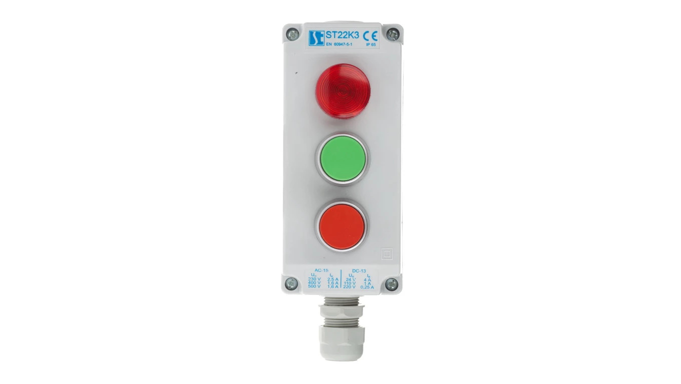 Kaseta sterownicza 3-otworowa zielony/czerwony/lampka czerwona 24V 1Z 1R IP65 1x dławnica M20 szara ST22K3\04-1