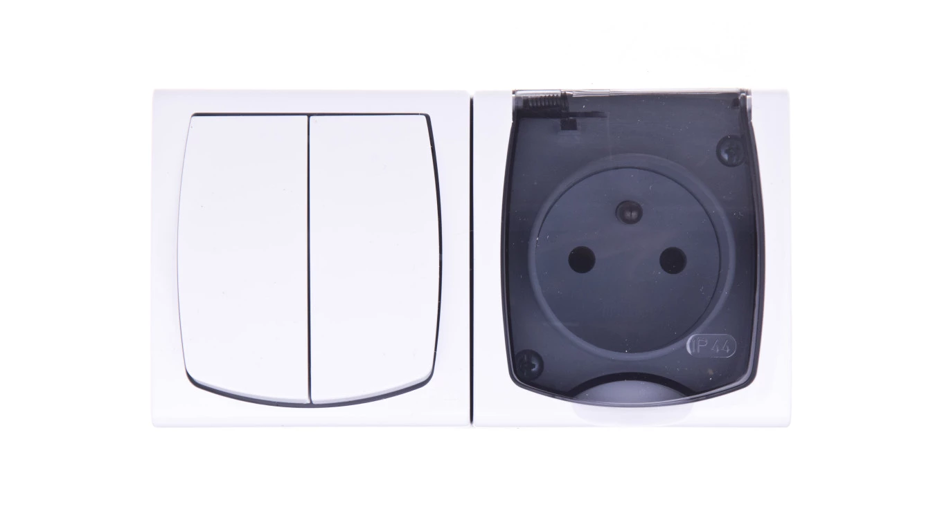 MADERA Łącznik hermetyczny świecznikowy + gniazdo hermetyczne pojedyncze z/u z klapką przezroczystą biały ZH-NŁ2G/00/d