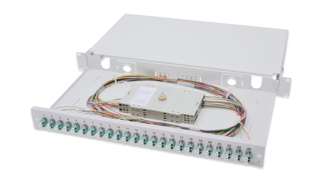 Panel krosowy FO z wyposażeniem 19 1U, 24x LC dx, OM3, pigtaile, adaptery, tacki, wysuwany, szary DN-96332/3