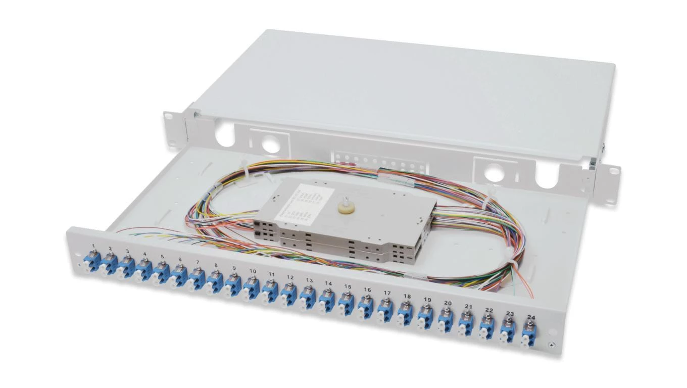 Panel krosowy FO z wyposażeniem 19 1U, 24x LC dx, OS2, pigtaile, adaptery, tacki, wysuwany, szary DN-96332/9