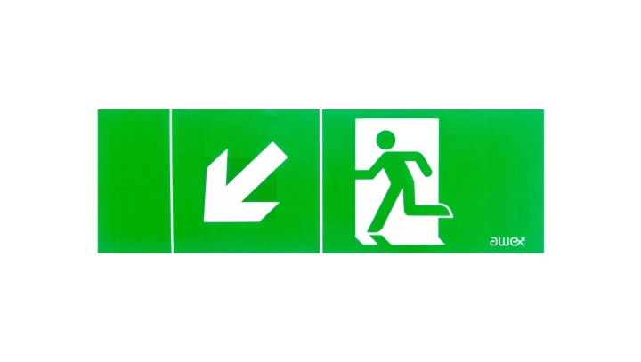 Piktogram PM22 100x300 obrotowa strzałka człowiek w drzwiach logo awex (ISO7010)
