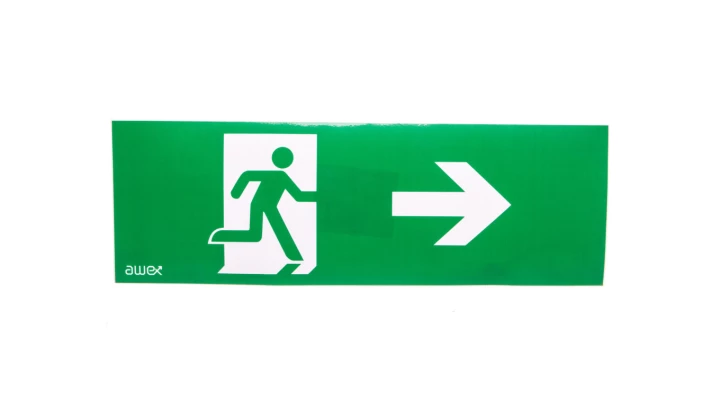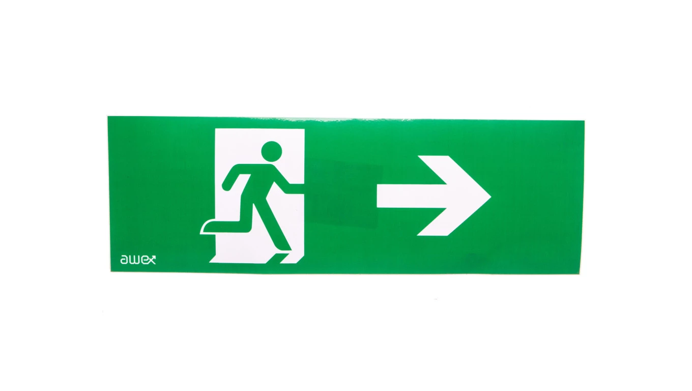Piktogram PM25 100x300 człowiek w drzwiach strzałka prawo logo awex (ISO7010)