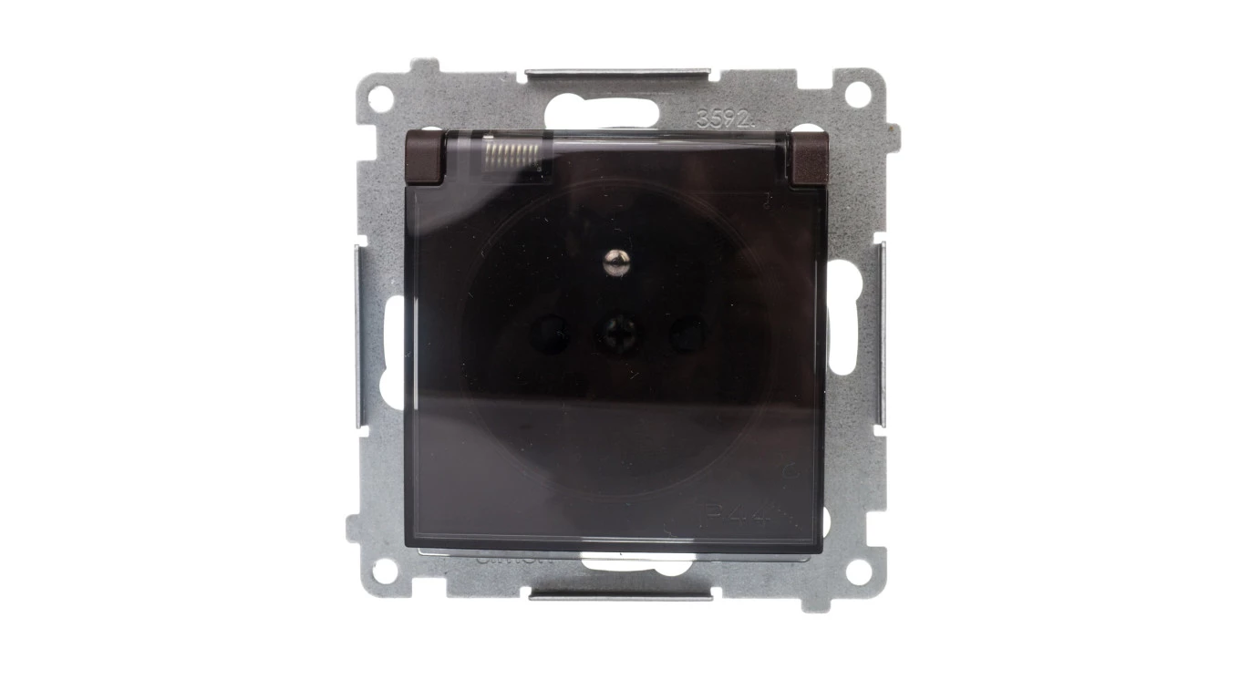 Simon 54 Gniazdo bryzgoszczelne (bez uszczelki) IP44 z przesłoną torów z klapką brąz mat DGZ1BUZ.01/46A