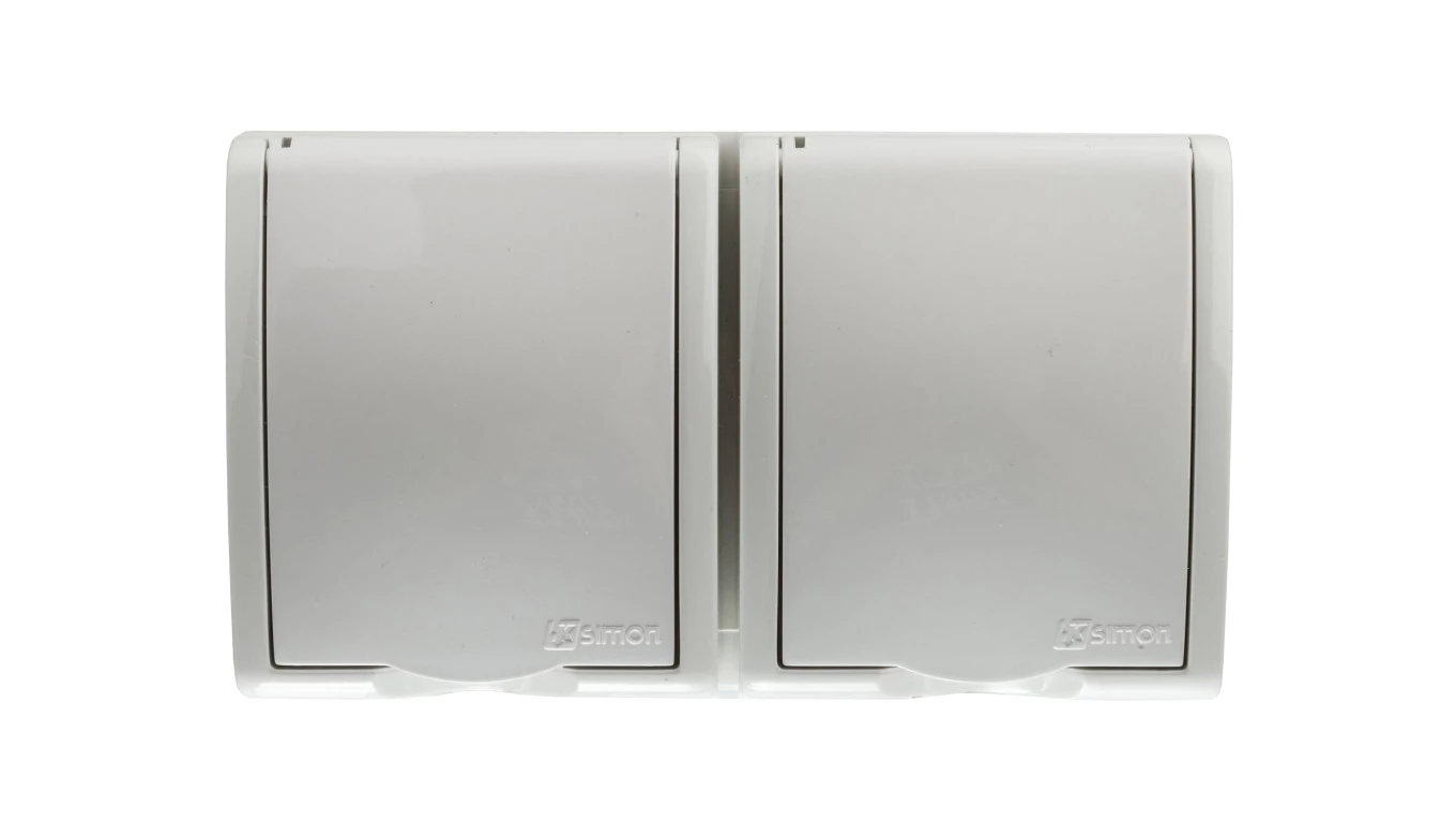 Simon Aquarius Gniazdo hermetyczne podwójne z/u IP54 z przesłoną torów i klapką pełną białe AQGZ1-2z/11