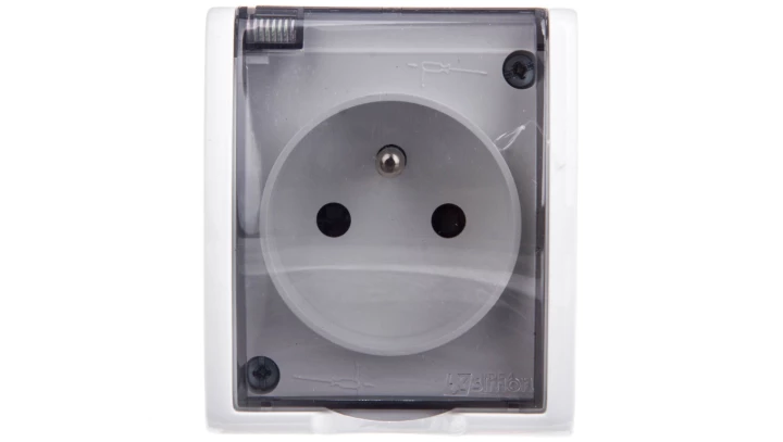 Simon Aquarius Gniazdo hermetyczne pojedyncze z/u IP54 z przesłoną torów i klapką dymną białe AQGZ1z/11a