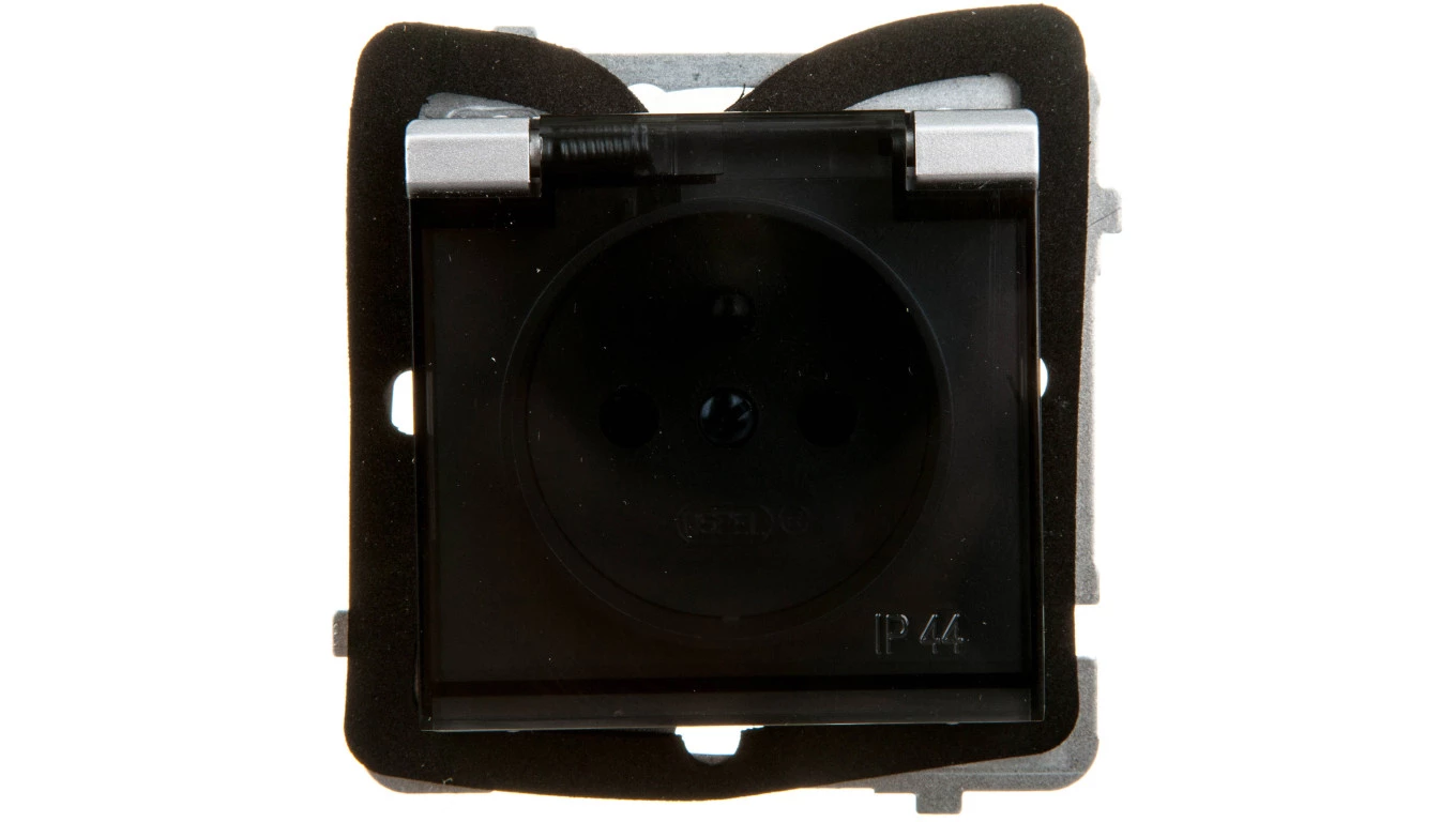 SONATA Gniazdo bryzgoszczelne z/u IP44 klapka przezroczysta srebro mat GPH-1RZ/m/38/d